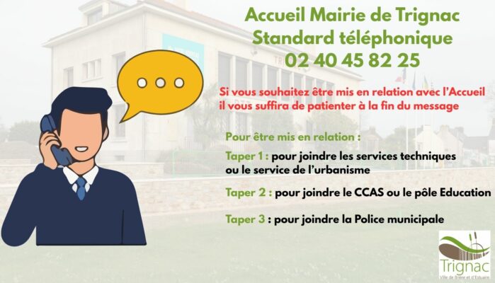 En contactant la mairie au 02 40 45 82 25, il vous suffira de taper 1, 2 ou 3 pour être mis en relation avec le service souhaité :