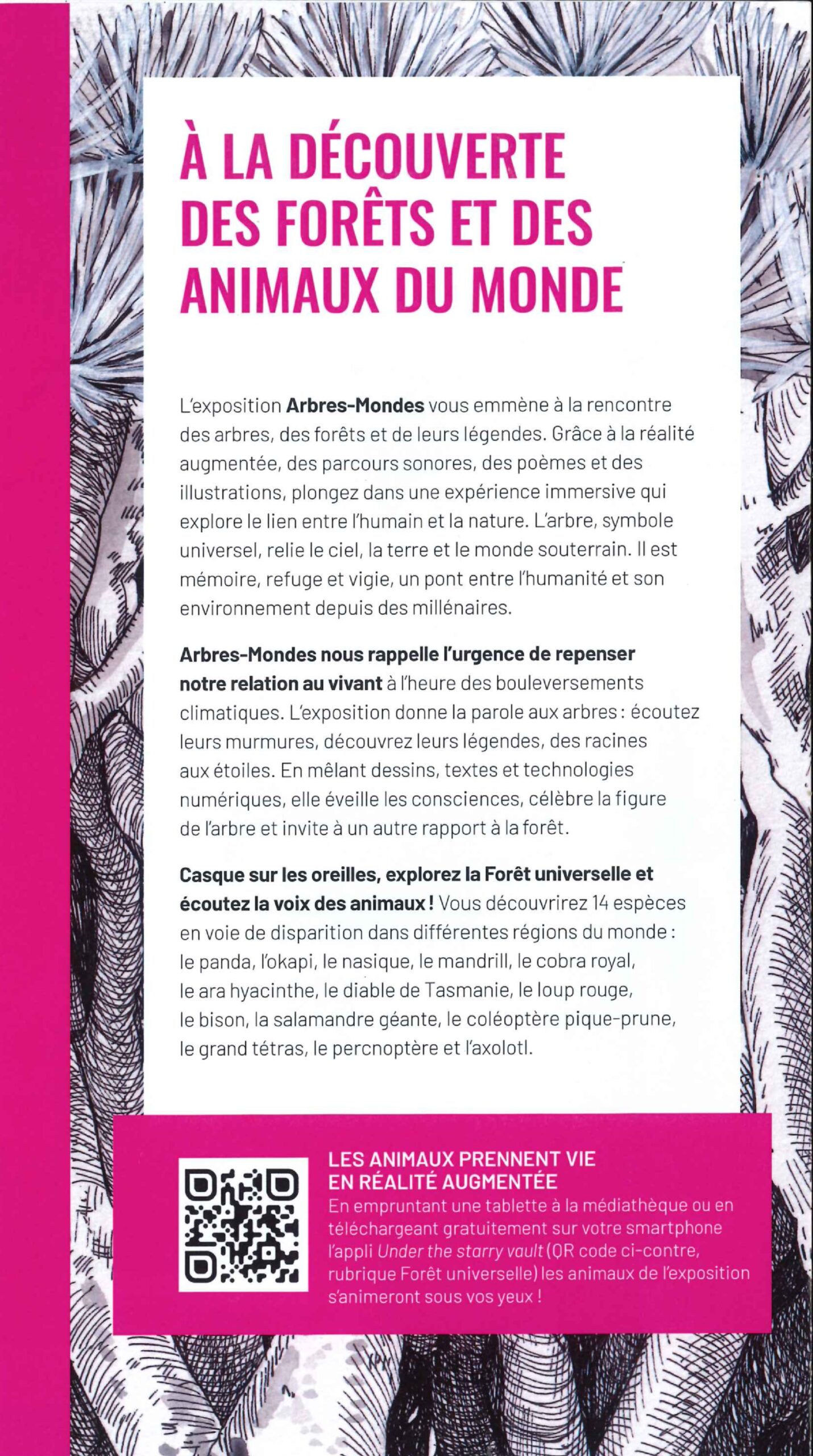 L’exposition Arbres-Mondes vous invite à un voyage unique à la rencontre d’animaux, d’arbres et de forêts à travers le monde. Grâce à la réalité augmentée, des parcours sonores, des poèmes, des photographies et des illustrations, plongez dans une expérience immersive qui explore le lien entre l’humain et la nature.