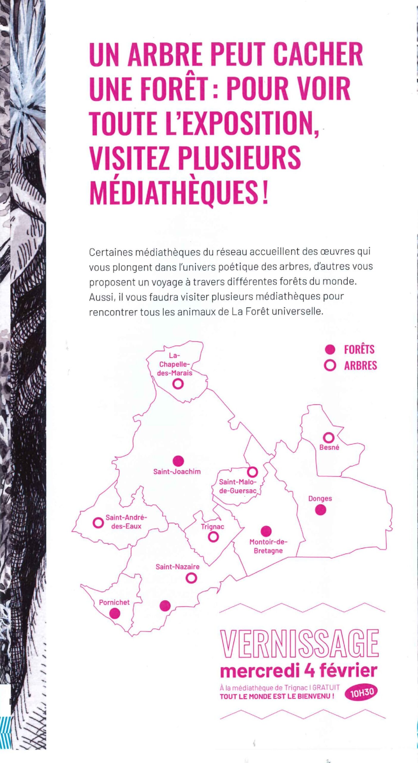 Certaines médiathèques accueillent des œuvres qui vous plongent dans l’univers poétique des arbres, d’autres médiathèques vous proposent un voyage à travers différentes forêts du monde. Aussi, il vous faudra aussi visiter plusieurs médiathèques pour rencontrer tous les animaux de La Forêt Universelle.