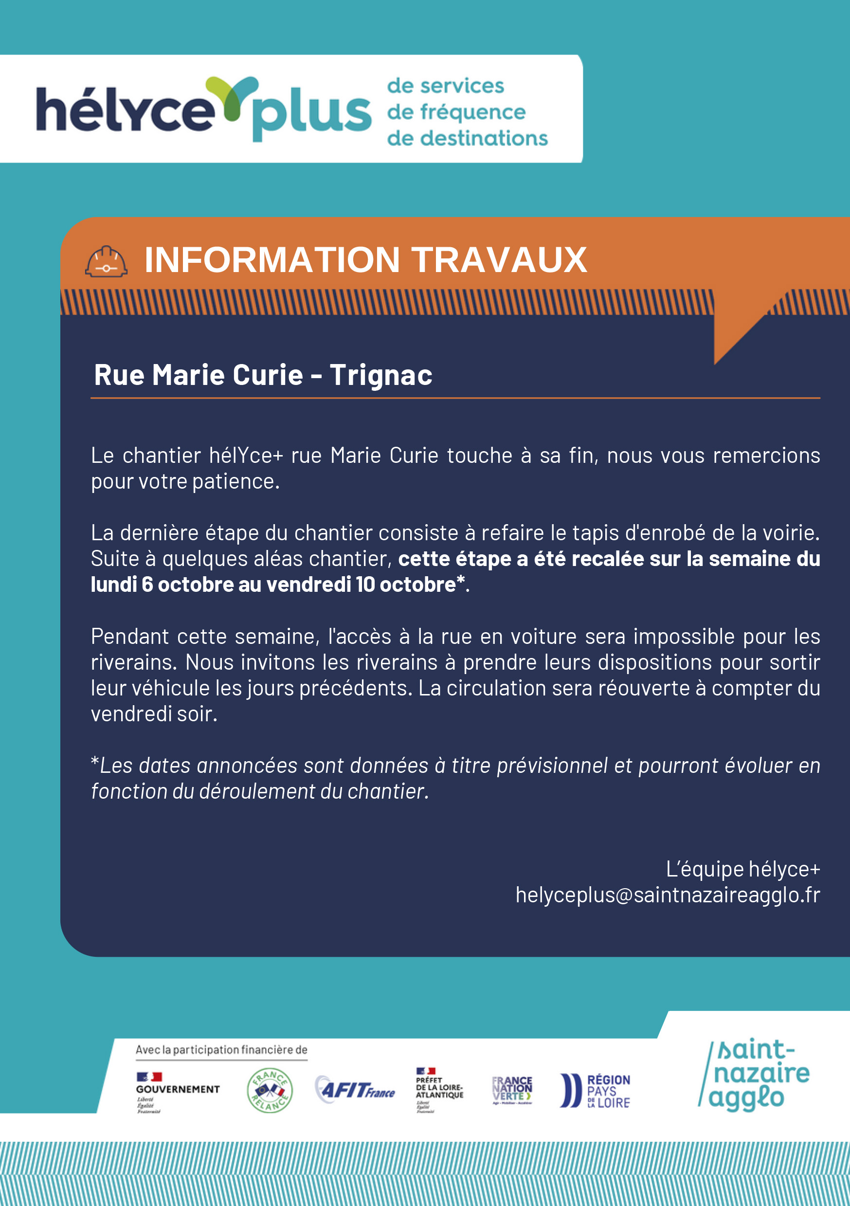 Dans le cadre des aménagements en cours rue Marie CURIE, des restrictions temporaires d’accès à votre domicile sont à prévoir :