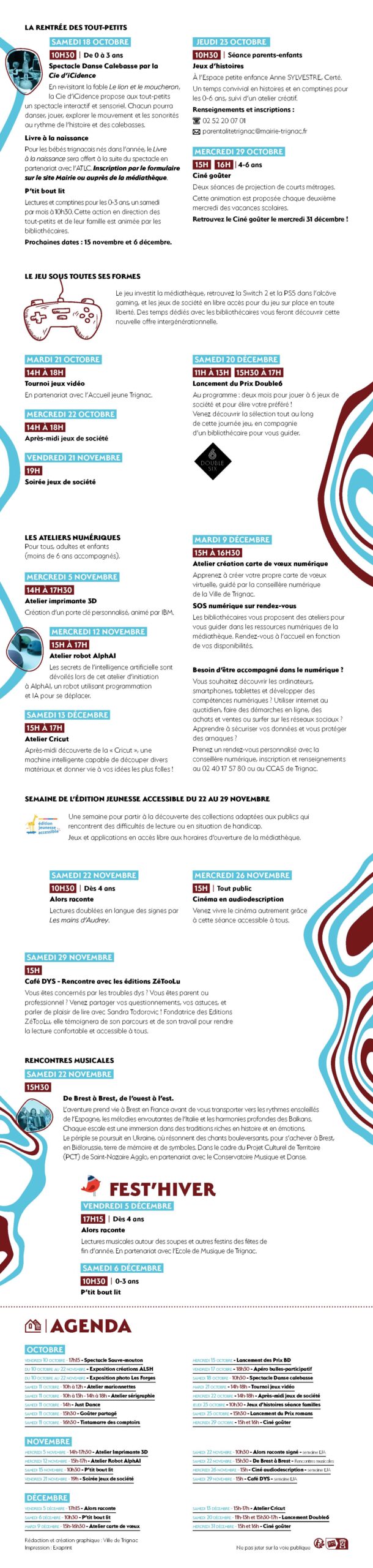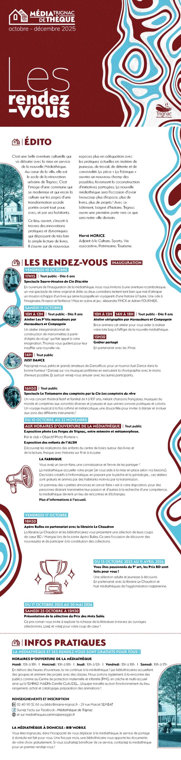 Pour toute demande de renseignements, vous pouvez nous contacter par mail (biblio@mairie-trignac.fr) ou par téléphone (02 40 90 32 66).