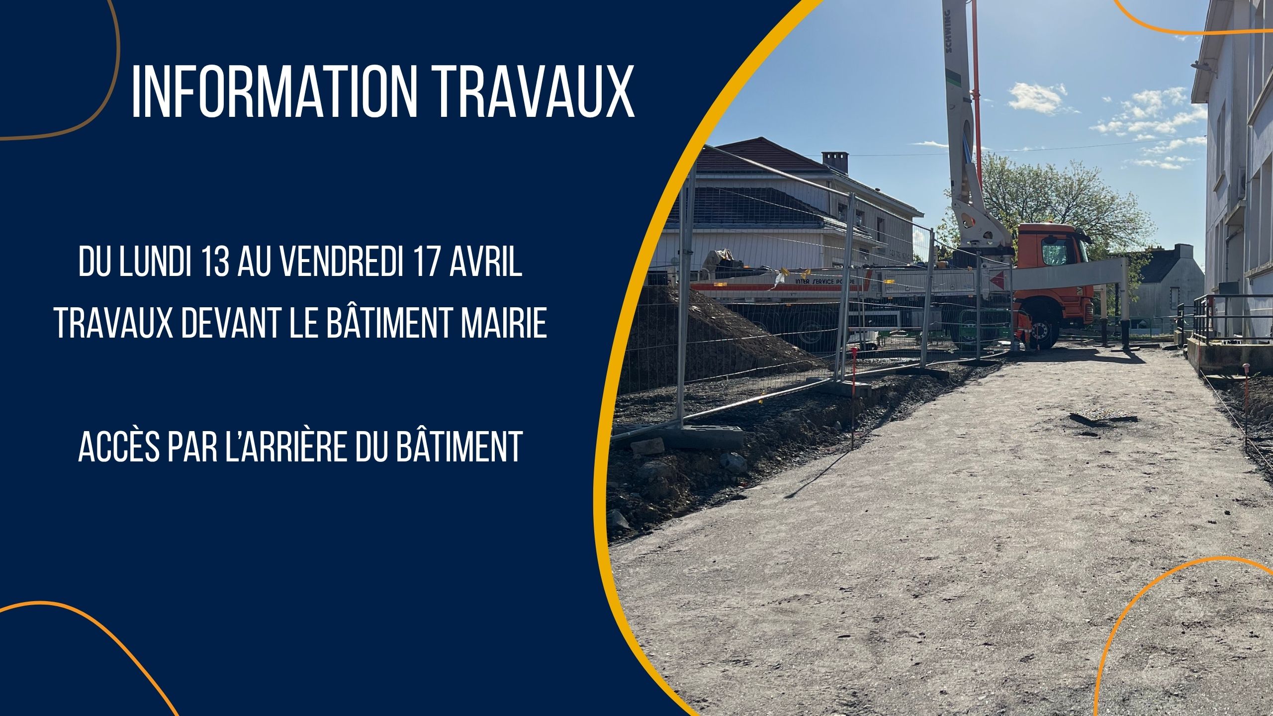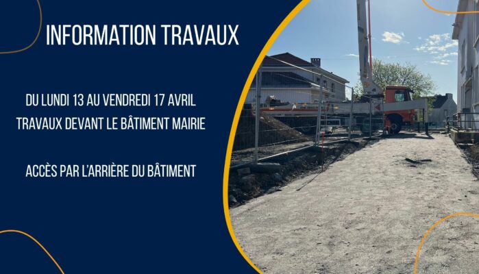 Du lundi 13 au vendredi 17 avril, en raison de la réalisation du béton micro-désactivé (et phase de séchage) devant l’entrée principale du bâtiment de la mairie, l’accès à la mairie ne pourra pas se faire par l’entrée principale.