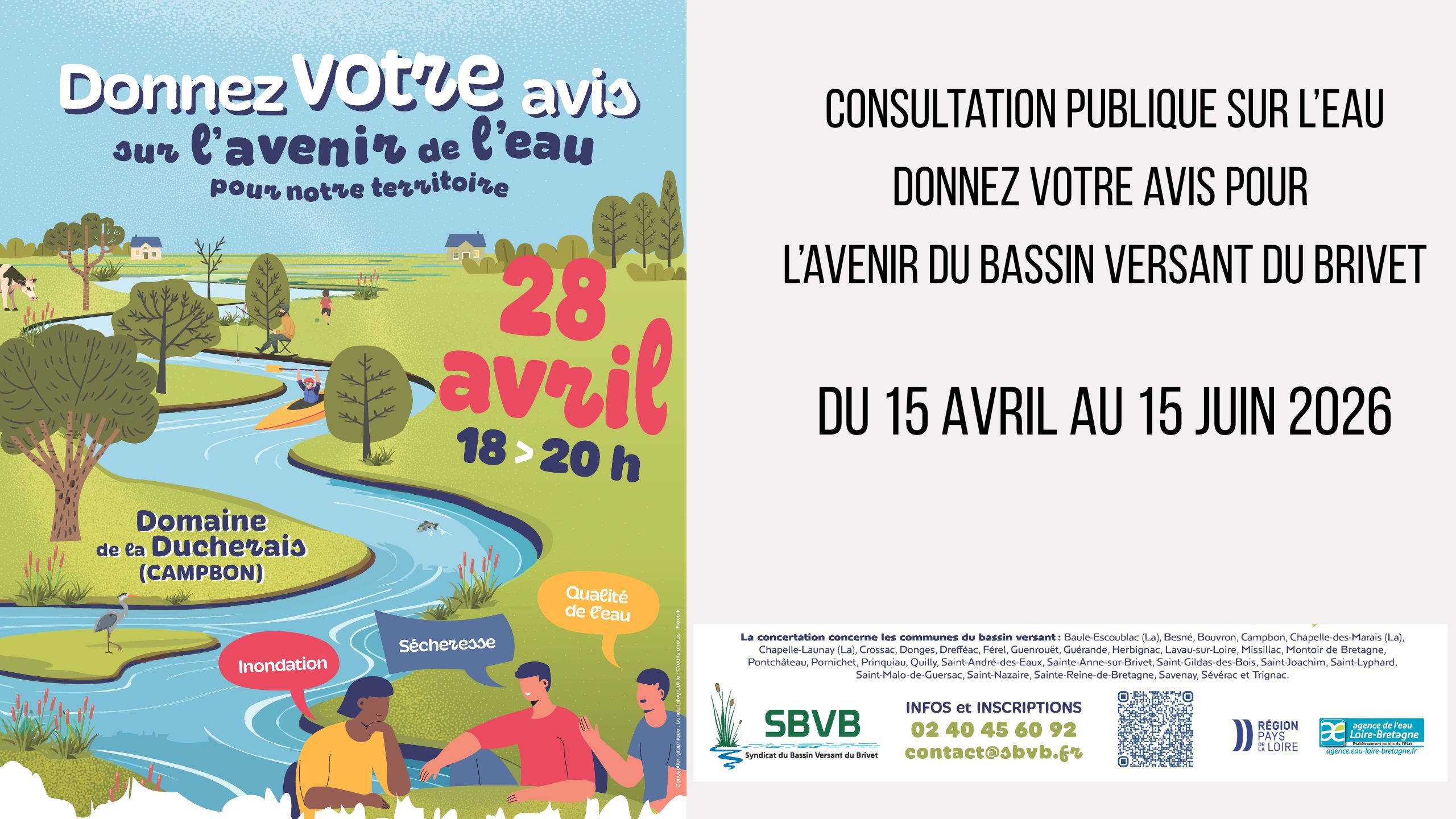 Le Syndicat du Bassin Versant du Brivet (SBVB) en partenariat avec l’Agence de l’eau Loire-Bretagne et la Région Pays de la Loire lance une consultation publique sur l’eau du 15 avril au 15 juin 2026.