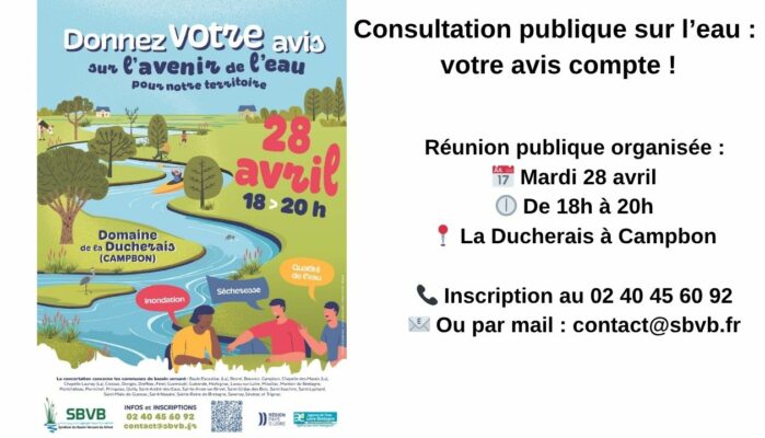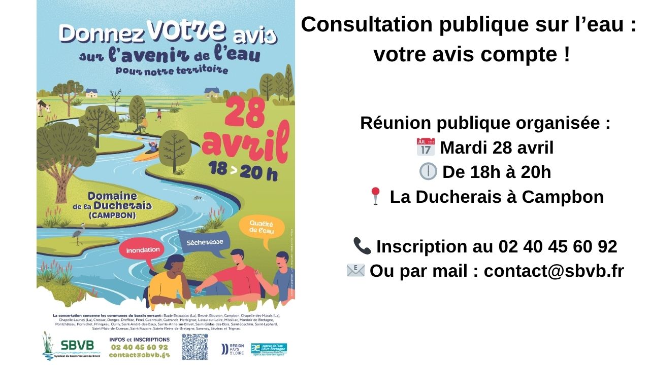 Le Syndicat du Bassin Versant du Brivet (SBVB), en partenariat avec l’Agence de l’eau Loire-Bretagne et la Région Pays de la Loire, lance une consultation publique sur l’eau du 15 avril au 15 juin 2026.