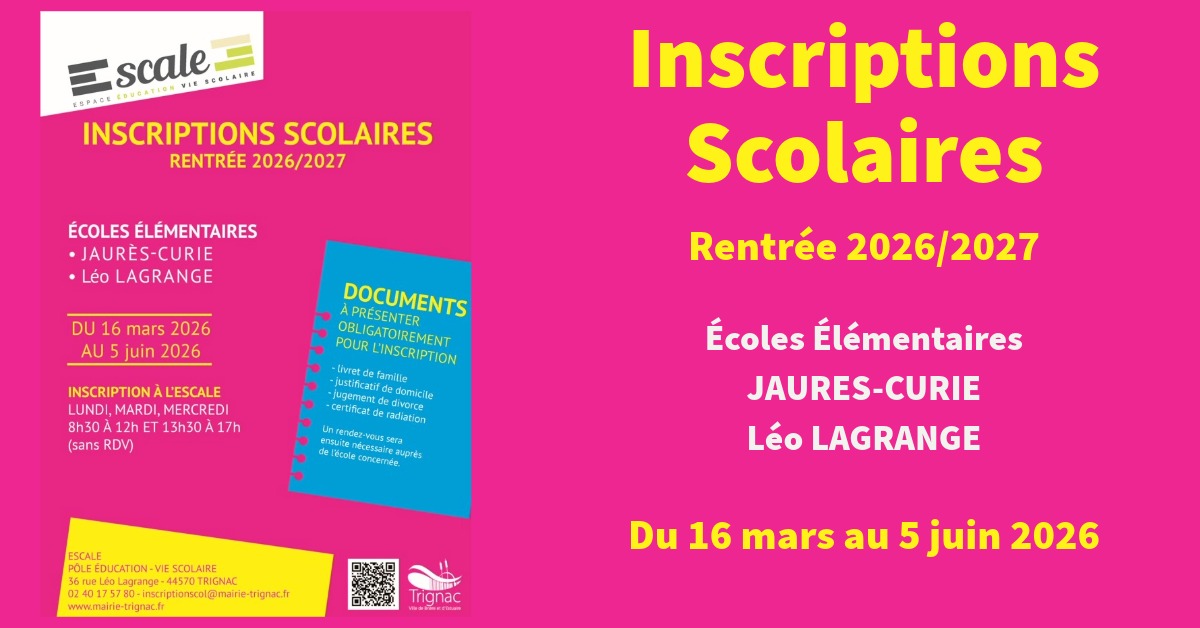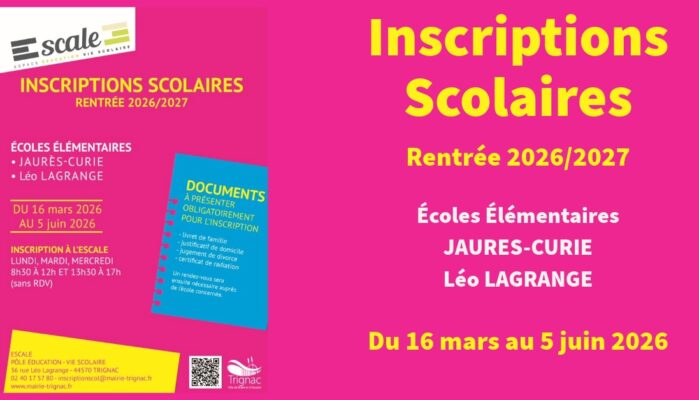 Lieu : Escale - Pole Education - Vie Scolaire 36 rue Léo LAGRANGE 44570 Trignac