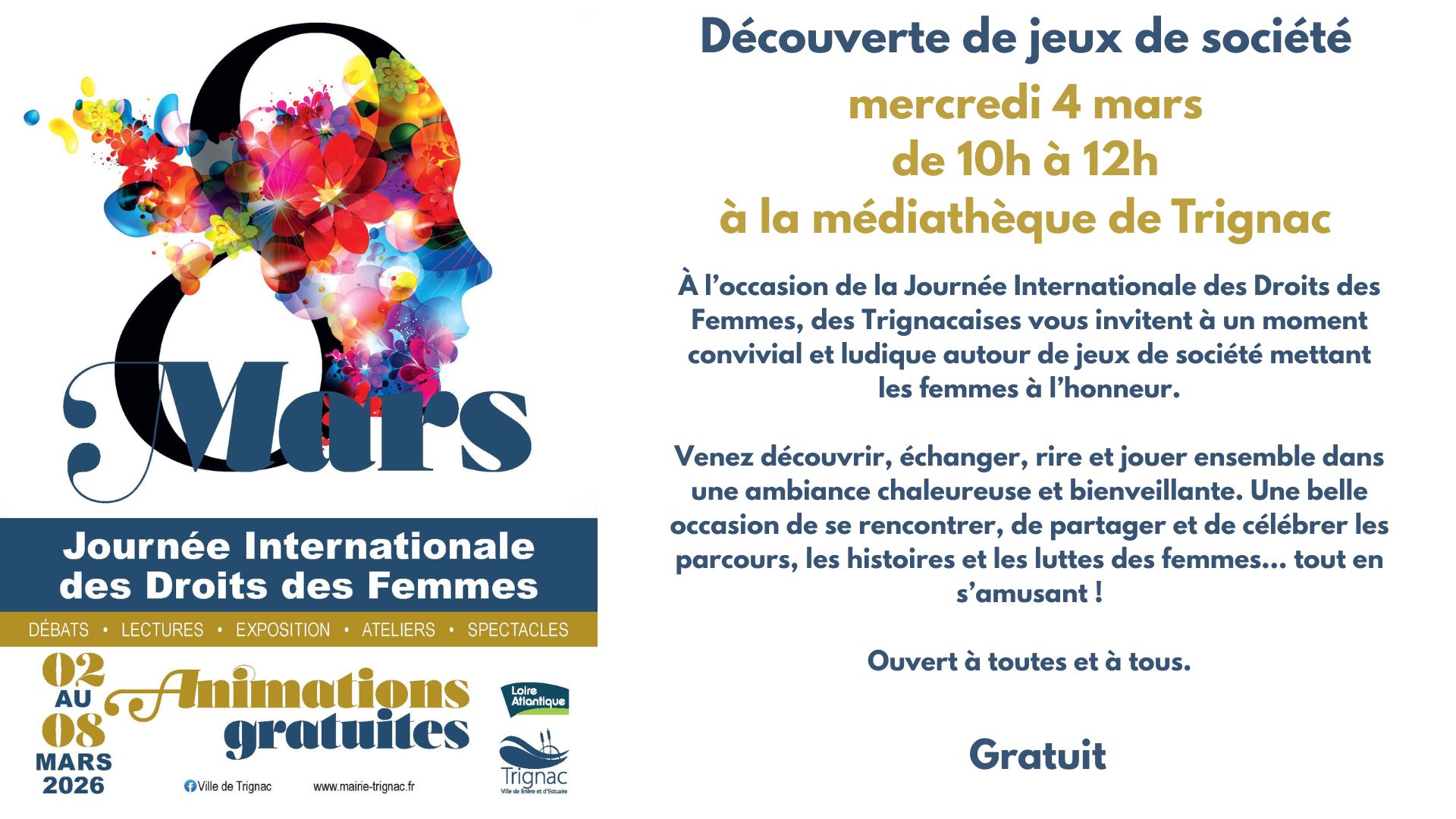 À l’occasion de la Journée Internationale des Droits des Femmes, des Trignacaises vous invitent à un moment convivial et ludique autour de jeux de société mettant les femmes à l’honneur.