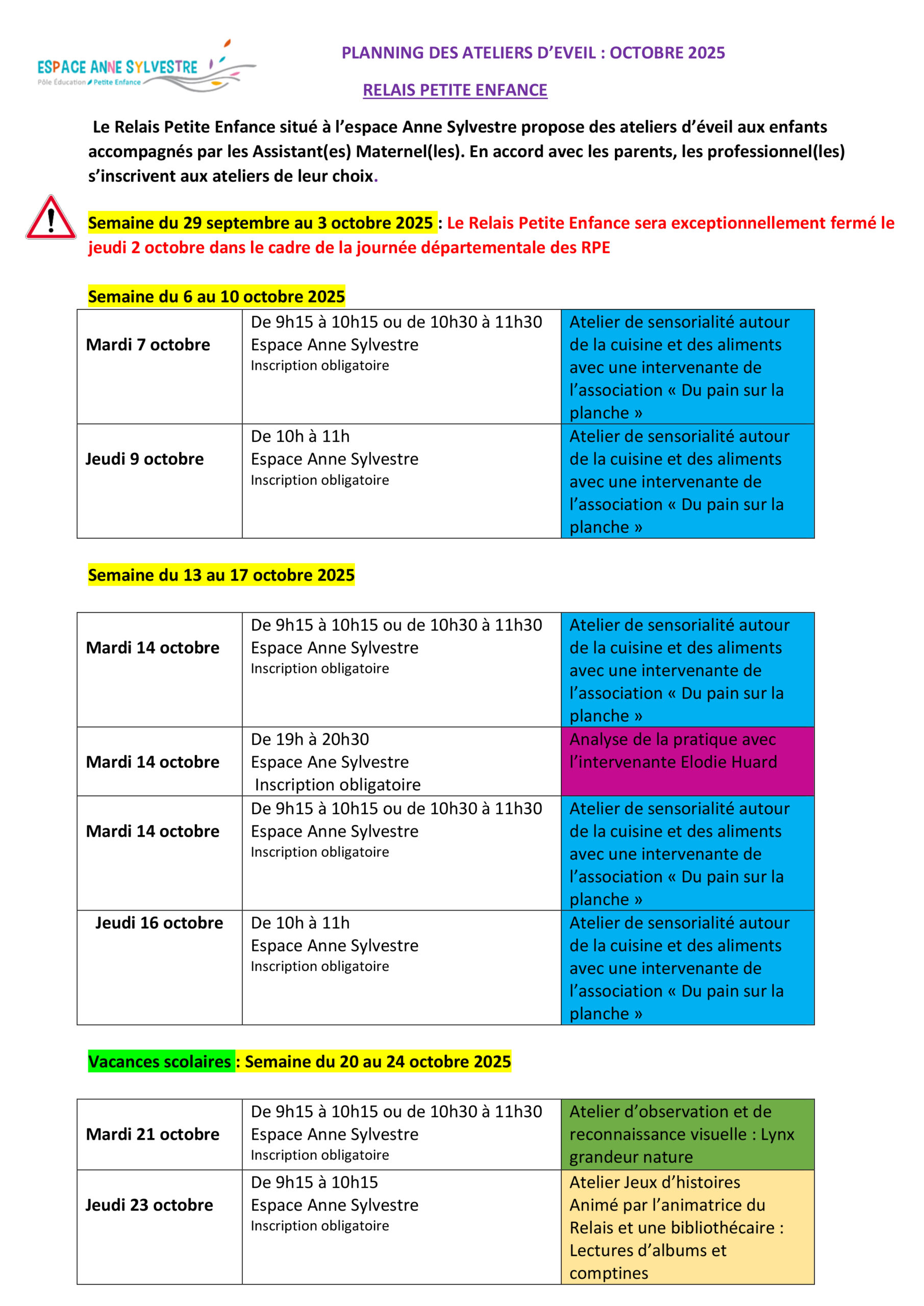 PLANNING DES ATELIERS D’EVEIL : ocotbre 2025