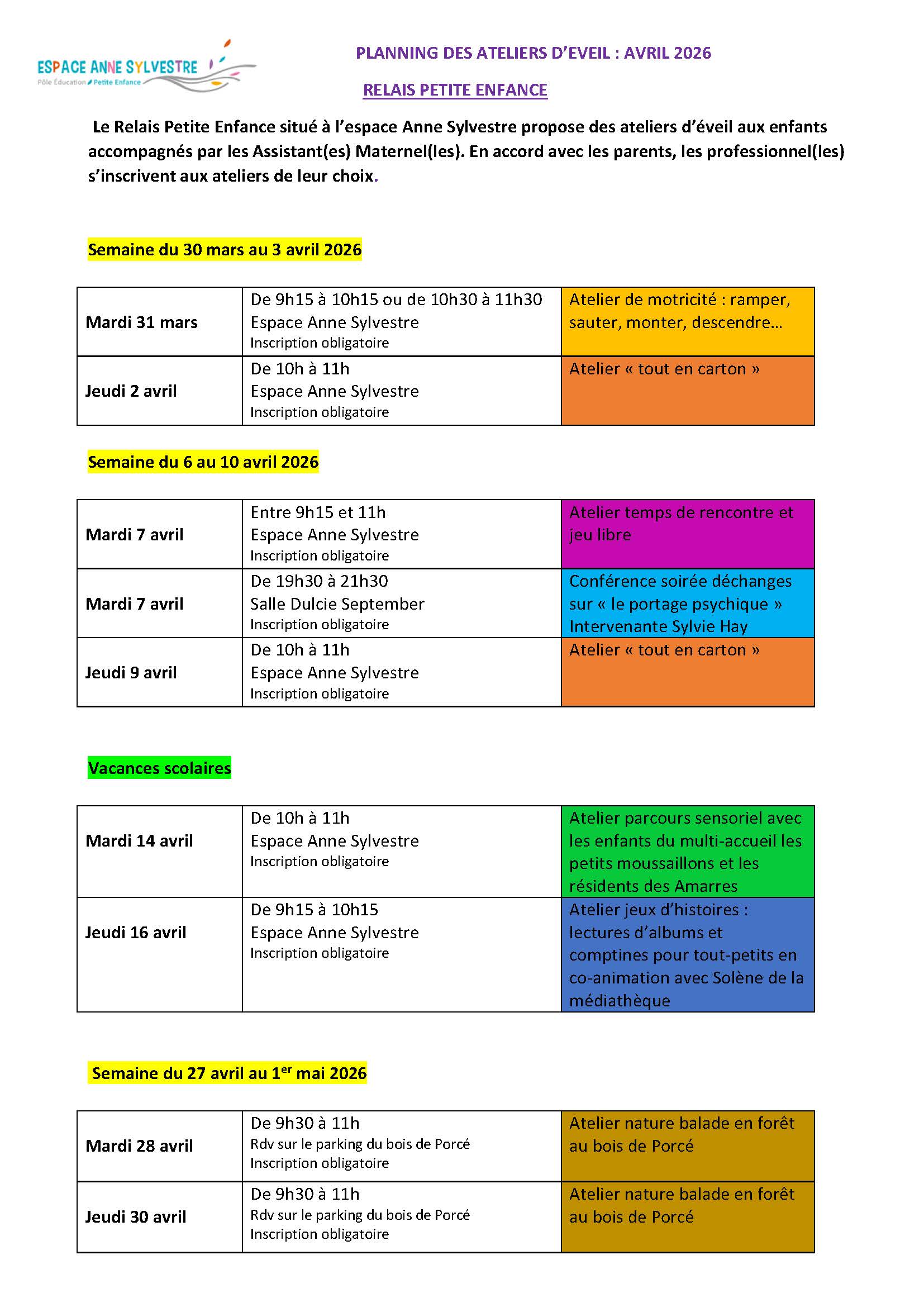 PLANNING DES ATELIERS D’EVEIL : avril 2026