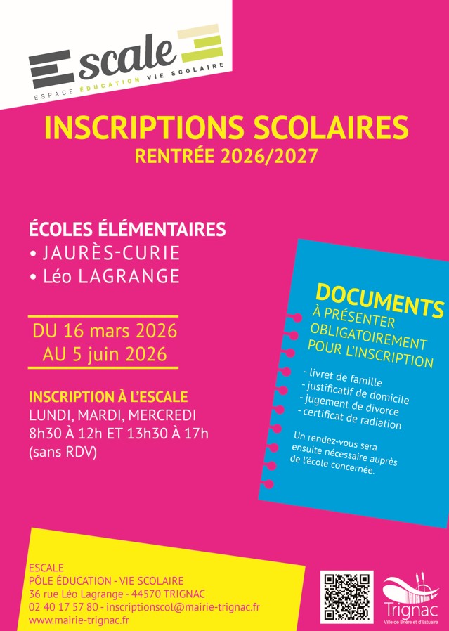 Pour l’année scolaire 2026/2027, les inscriptions scolaires pour les écoles élémentaires publiques de Trignac
