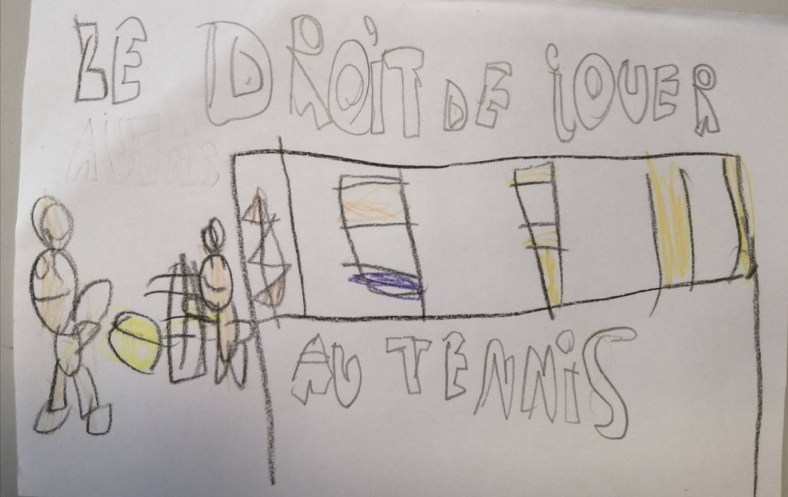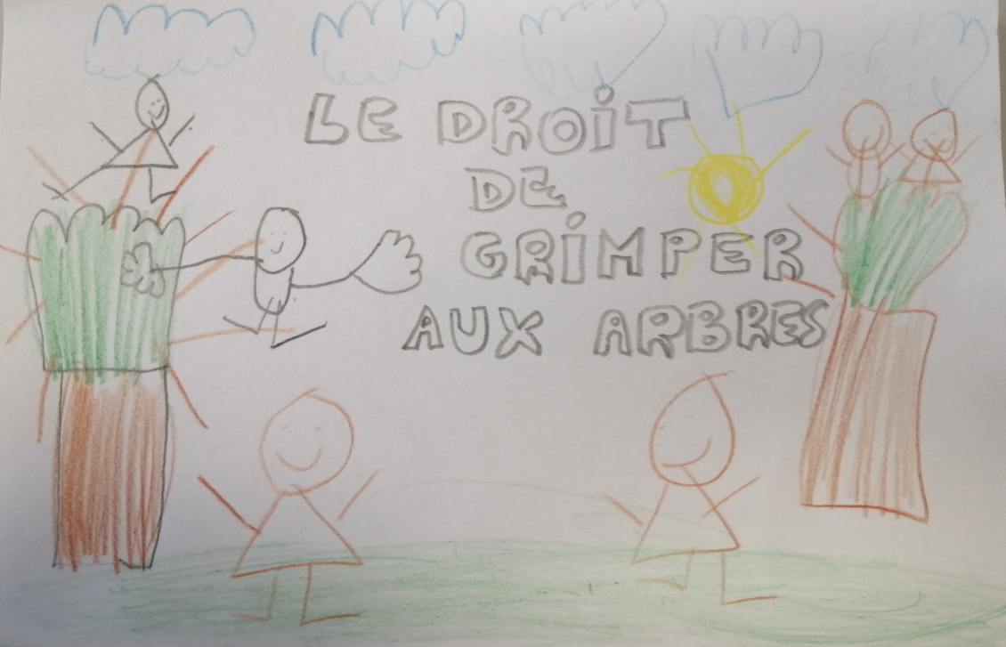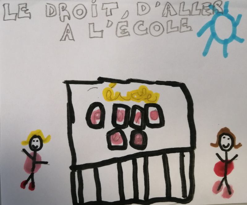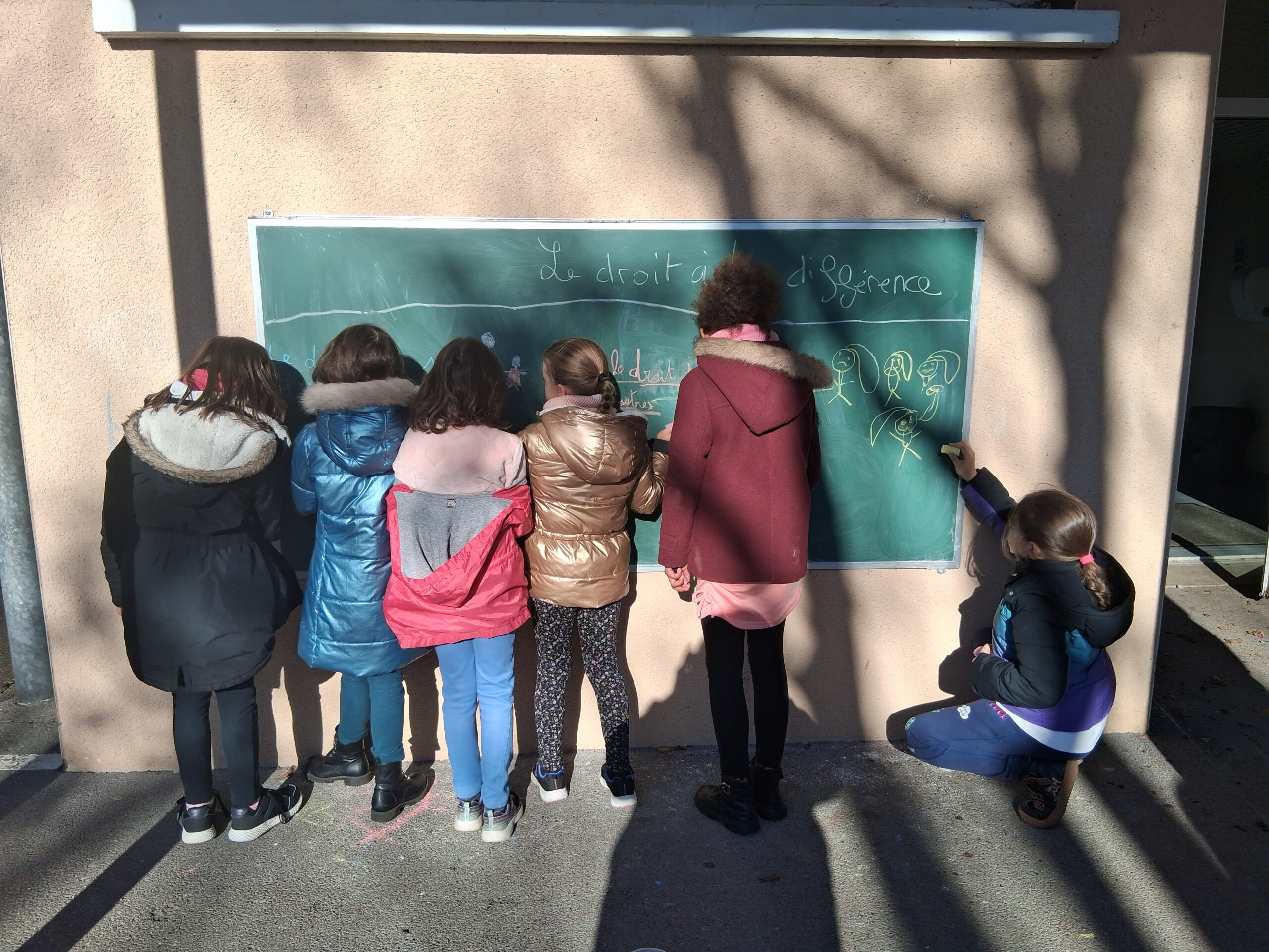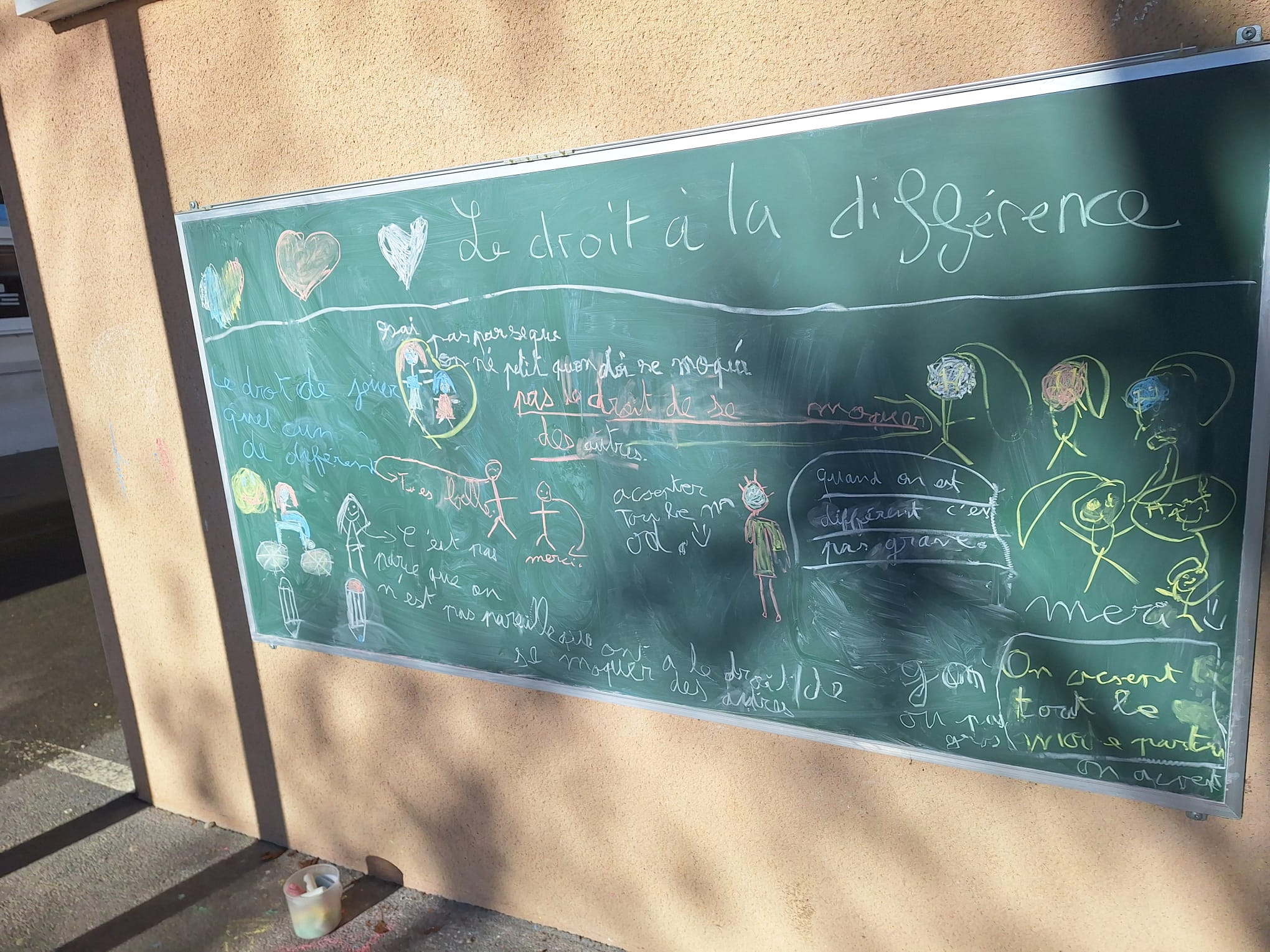 Les enfants des classes de CP au CM2 ont pu s’exprimer librement sur un tableau, avec des craies, ils ont dessiné et écrit au moins un droit issu de la convention internationale des droits des enfants, en sélectionnant ce qui est important pour eux. Cela a permis d’échanger avec l’équipe d’animation autour de leur choix.