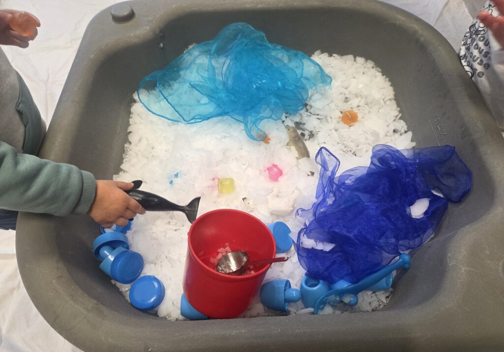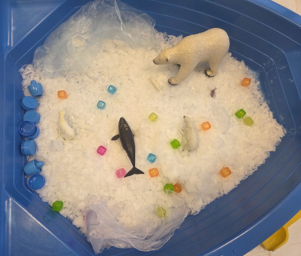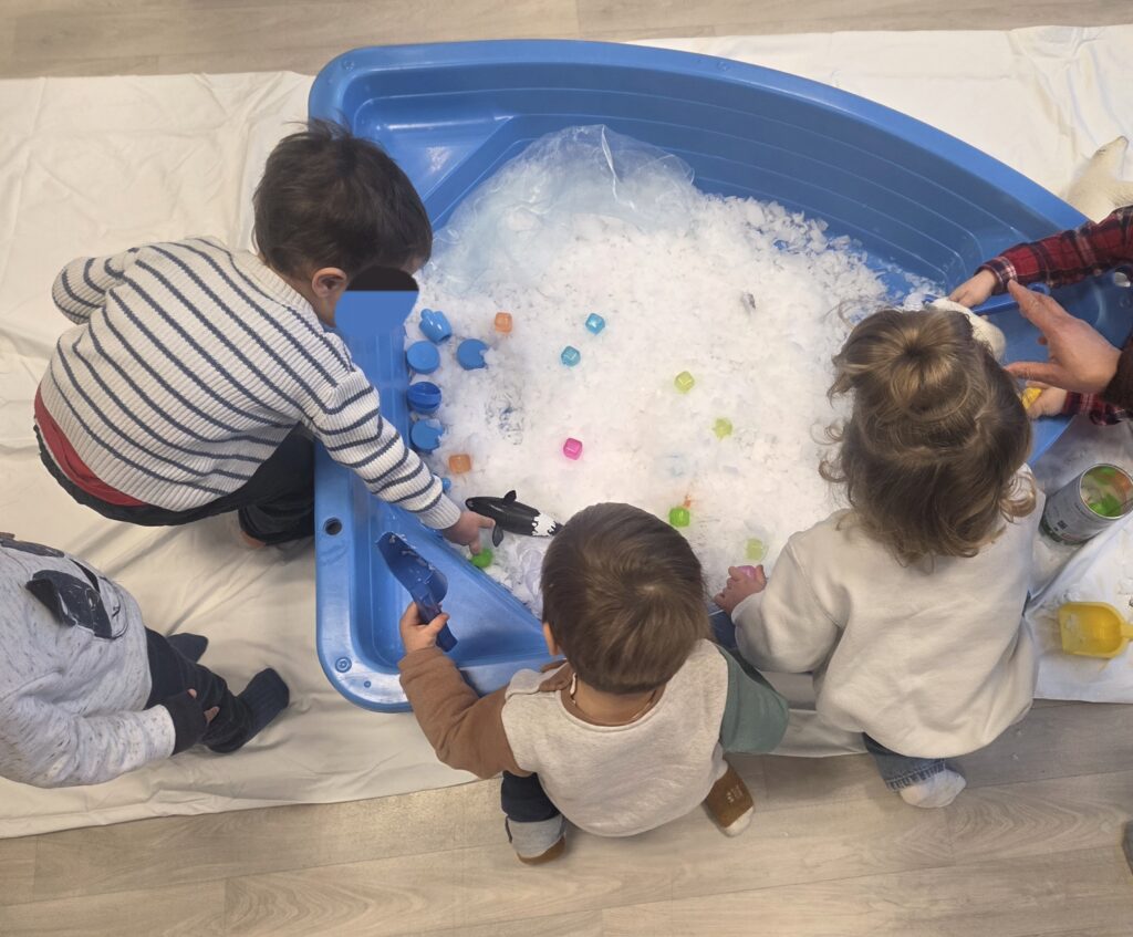 Les enfants et les assistantes maternelles ont pu manipuler de la glace, transvaser, goûter, nommer les animaux polaires et expérimenter la transformation de la glace en eau.