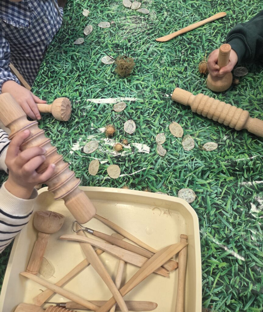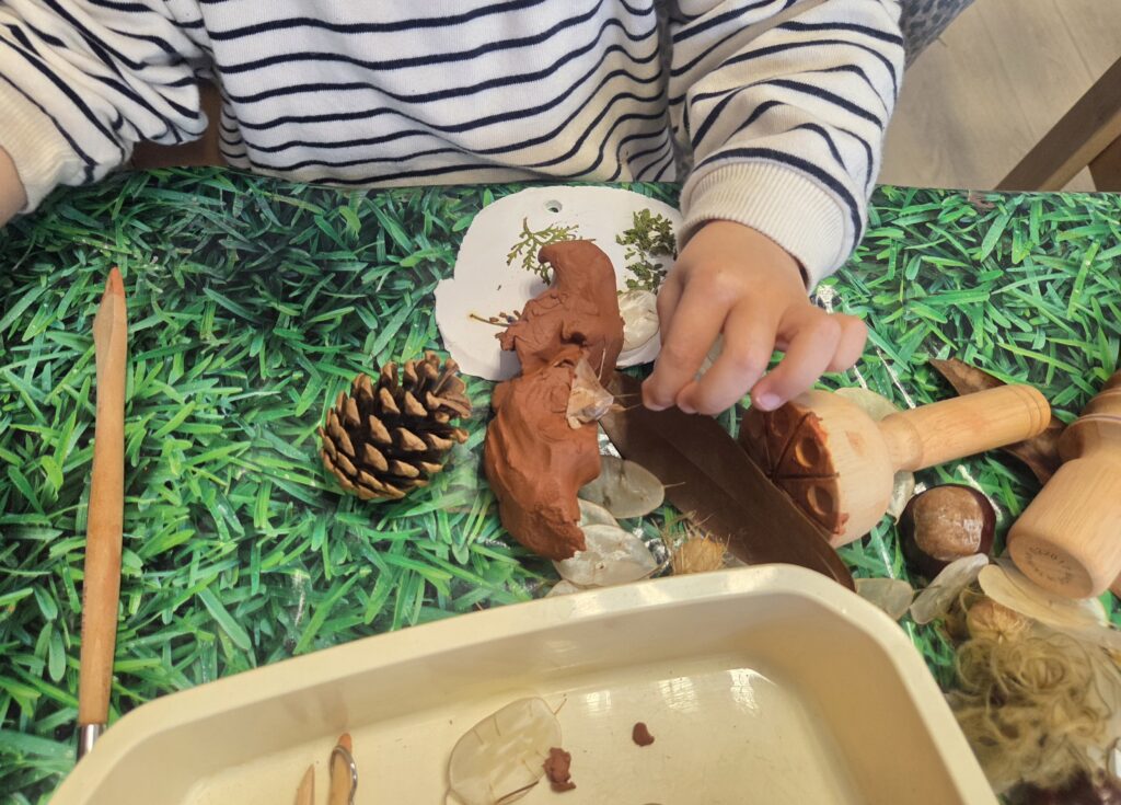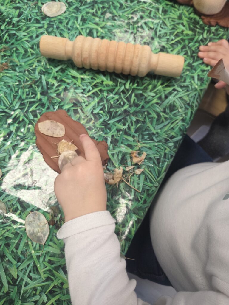 Aussi, de l’argile était proposé avec des éléments innovants de la nature pour laisser la possibilité à l’enfant de jouer avec la notion de trace, d’empreinte. Pour les artistes en herbe, un plaisir de pouvoir manipuler, sentir, goûter parfois, jouer avec la matière !