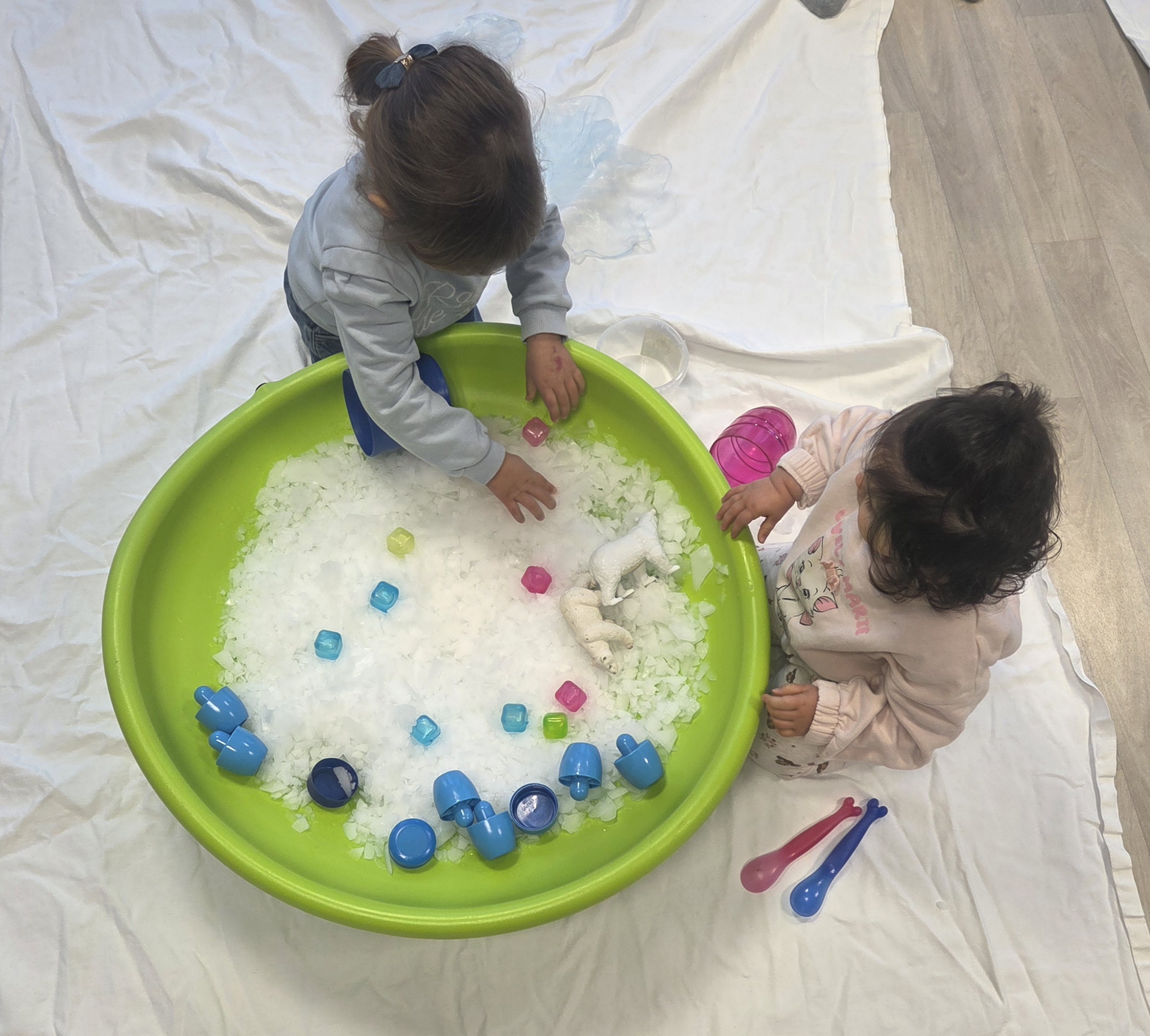Les enfants et les assistantes maternelles ont pu manipuler de la glace, transvaser, goûter, nommer les animaux polaires et expérimenter la transformation de la glace en eau.