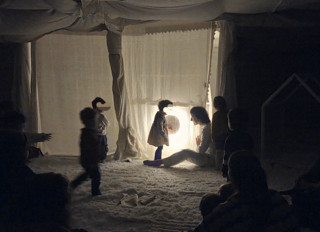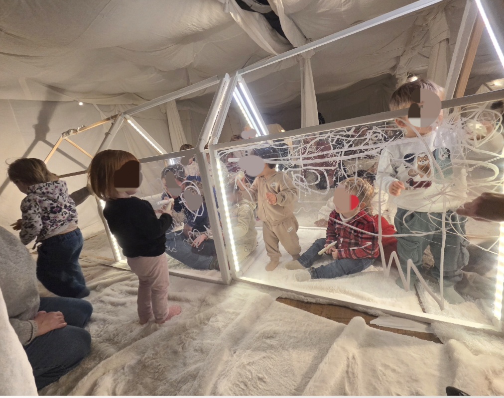 Une exploration totalement immersive et sensorielle où les enfants (et les professionnelles) se sont laissés embarqués dans une bulle « hors du temps ». Certains ont observé tandis que d’autres ont été acteurs dans la création de ses cabanes, dans le respect du libre-choix de chacun. Un décor « cocooning tout en blanc » mené par 2 artistes qui invitent petits et grands à rentrer dans leur monde.