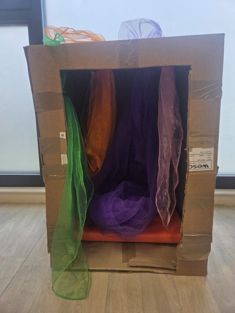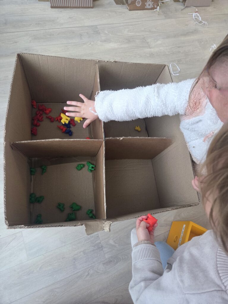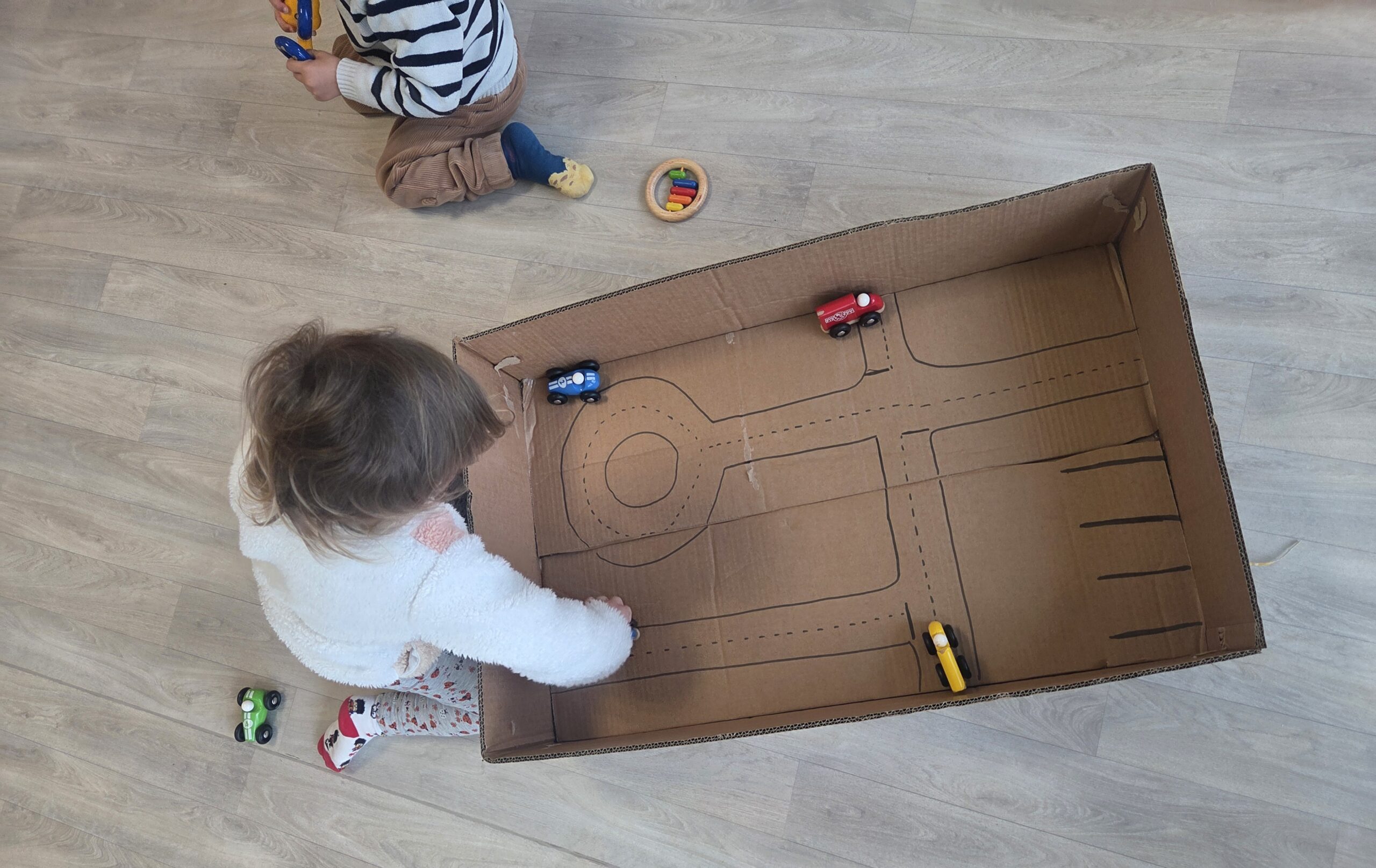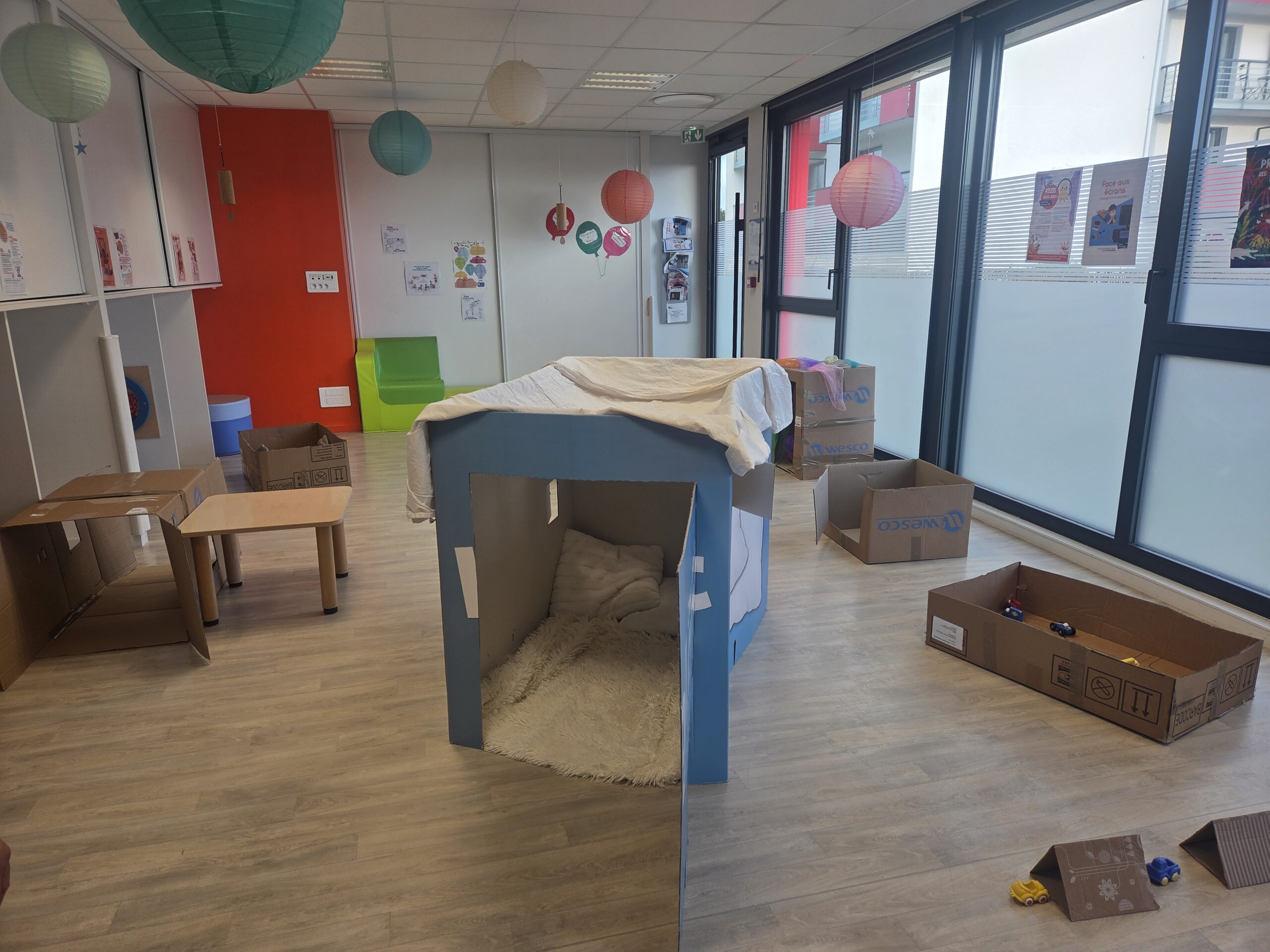 Un aménagement de la salle tout en carton : une cabane en carton pour se cacher, un carton pour trier de petits animaux, un carton tunnel, un carton avec du papier, un carton pour jouer sur un circuit de voitures, un carton pour se reposer….
